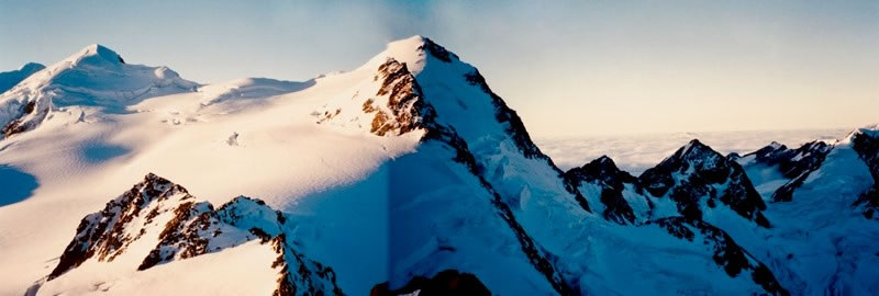 This a panoramic picture (that I created by “photostitching” two pictures together) of the view from Kelman Hut. Hochstetter Dome is the highest peak on the left-hand horizon, while Mt Aylmer is in the centre of the picture.