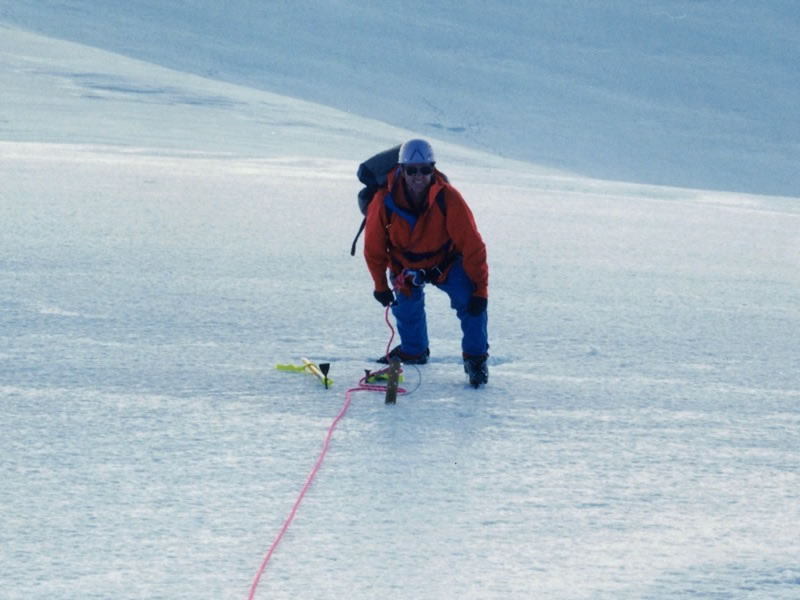 Secured to a snow-stake, I belayed Gerry while he led the way up the final somewhat icy slopes of the south face.