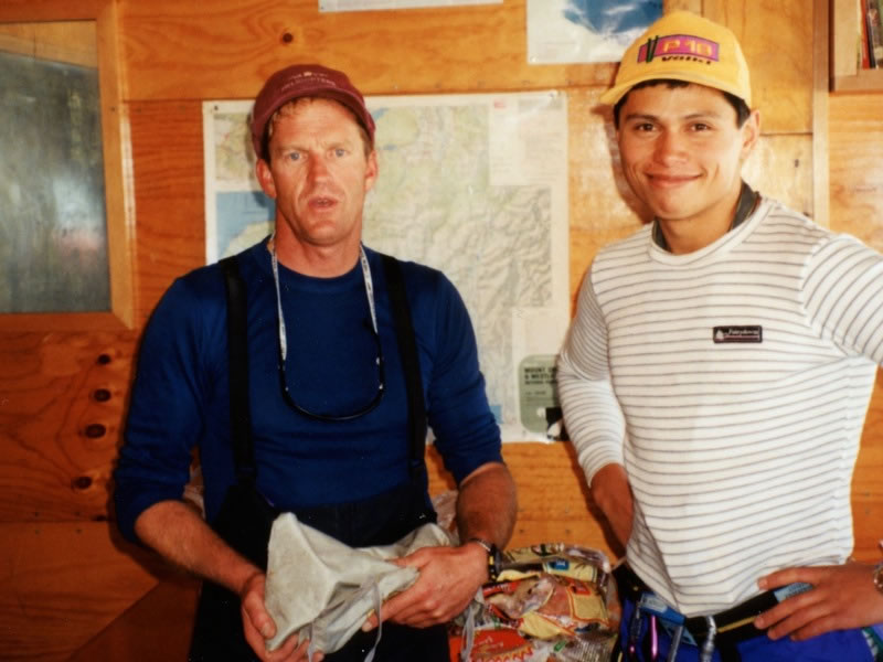 After we’d climbed Mt Aylmer, Gerry and I made our way back to Kelman Hut. The weather forecast was not promising, so Gerry made a quick, but extremely well-judged, decision to leave the hut and fly south, where if needs be we’d be able to get out of the mountains under our own steam. As a result, we said a quick hello and an ever quicker goodbye to two people who’d arrived at the hut while we were climbing Aylmer – namely, mountain guide Charlie Hobbs (who’s on the left in this picture) and a young client of his. Sadly, to date, I’ve never been back to the Tasman Saddle area. (This is the last picture in this album.) |