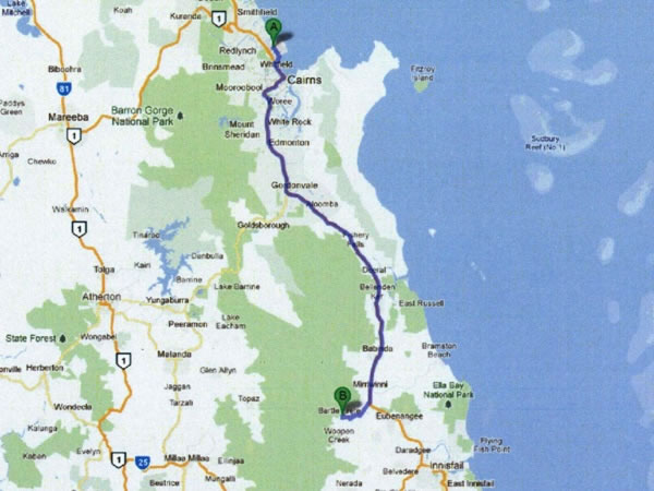Eric and I immediately drove our small rental car roughly 70 kilometres / 43 miles south to Mirriwinni, a small town near the base of Mt Bartle Frere. Although the mountain is closer to a major airport than any of the other Australian state and territory highpoints, this is somewhat ironic, because Mt Bartle Frere is probably the hardest and most tiring peak to climb of the eight state and territory summits. |