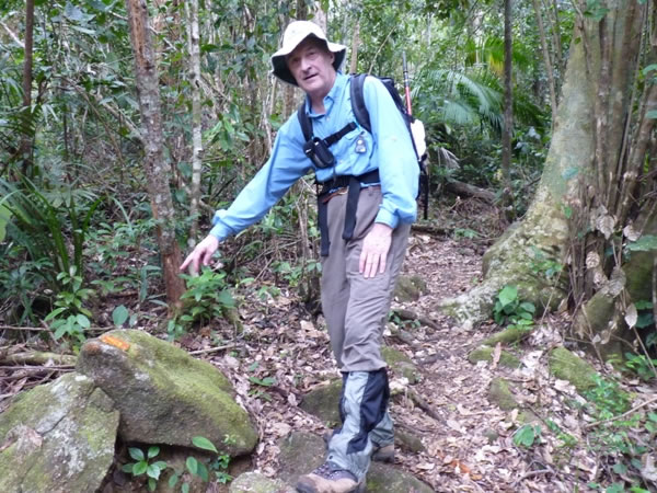 You can measure your rate of progress when you climb Mt Bartle Frere, because the Queensland parks authorities have fixed metal kilometre markers onto rocks and trees alongside the trail. After two hours and eight minutes, we reached the 4-kilometre mark (i.e., we’d covered two-and-a-half miles). Whereas we took an average of 28 minutes to cover each of the first three kilometres, we averaged almost twice that time per kilometre while ascending the final 4.5 kilometres to the summit. |