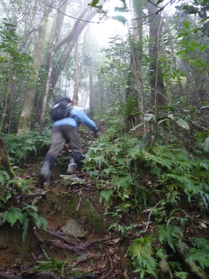 This photo – taken at 8:50 am – shows the steep nature of the track: it was often a rough stairway of tree roots.