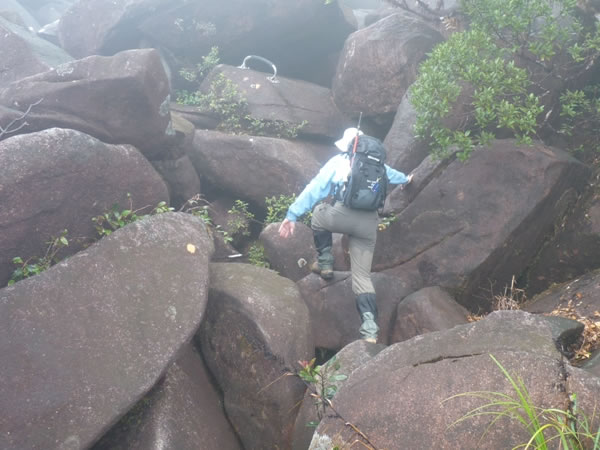 The second boulder field involves some fairly tricky scrambling, but the route through the boulder field is well marked and (as can be seen in this photo) there are also some carefully designed rubber-covered railings to assist climbers navigate the field safely. |