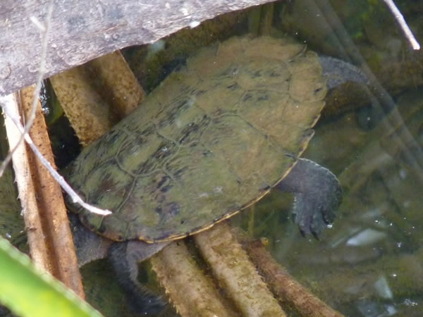 A saw-shelled turtle clambering across vegetation at the edge of Lake Eacham.