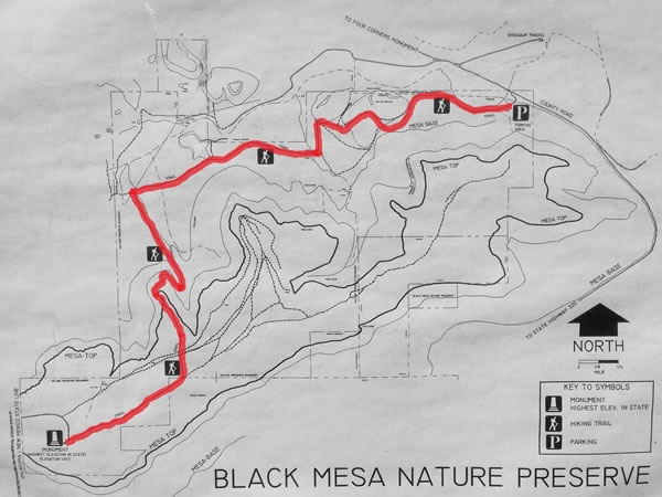 This is a photograph of a map of the Black Mesa Nature Preserve that was on the notice-board above the box that contained the hikers’ intentions’ register. It shows the route I took to get to the summit and back (which I’ve highlighted in red). The distance from the parking area to the Black Mesa summit monument is 4.2 miles / 6.75 kilometres (making the total hike a round trip of 8.4 miles / 13.5 kilometres), and there is an overall elevation gain of 654 feet / 199 metres. |
