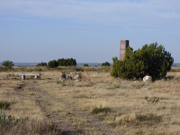 A bench, boulders, juniper bushes, and the 9-foot / 2.75-metre high monument at the summit of Black Mesa.