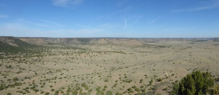 Shortly after I started heading down off the Black Mesa plateau, I paused to take this panoramic photograph of the wide valley at the foot of the mesa. I’d taken a similar photograph on my way up, but now the entire valley and the mesas in the distance were all bathed in bright sunshine. As a result, it was very hot when I hiked the last two miles across the plains on my way back to the trailhead. |