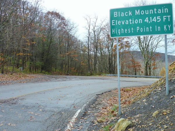 This sign stands beside the road a few yards past the “Welcome to Kentucky” sign, but it’s misleading. This is not the top of Black Mountain. To reach the summit, I had to turn left and drive up a dirt road next to the rusty signpost that’s just visible near the left-hand edge of the photograph. |