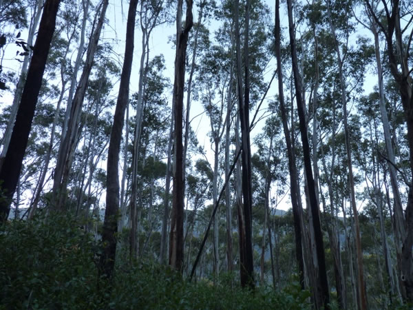 The lower slopes of Mt Bogong are covered in eucalyptus forest. When it got lighter (that is, at about 7:00 am), I took this picture of tall, mature trees towering over a thick undergrowth of gum-tree saplings.