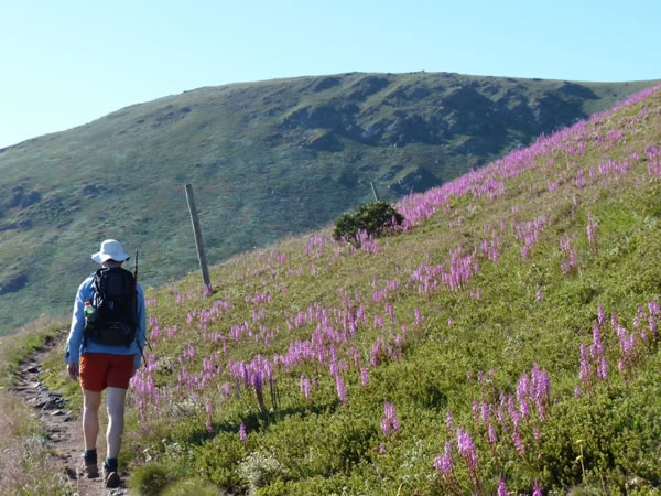 Above the tree line, the alpine flowers – particularly pink grass trigger plants – were especially prominent.