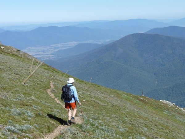 Eric making his way down the mountain. The Kiewa Valley-Mt Beauty plains are visible in the top third of the picture, while the memorial plinth to the three climbers who died in 1943 can be seen near the lower right-hand edge of the treeless ridge running diagonally across the photo. |