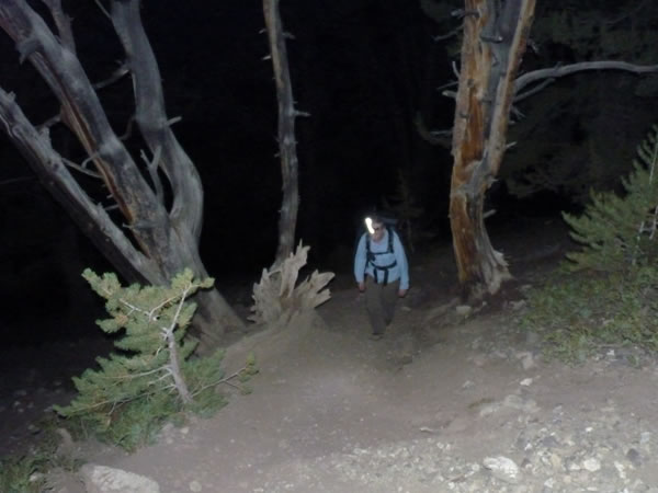 With his head-torch illuminating the way, Eric zig-zags (that is, switch-backs) up the first section of the Borah Peak trail.