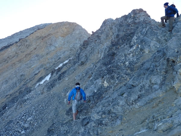 To cross snow that was in the couloir, we initially climbed down into the gulley. This picture shows Jeff (on the left) at the bottom of the climb, and Eric, at the top, just starting to descend the couloir.