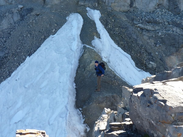 The snow bridge was, in effect, now a moat and completely safe to cross! Nevertheless, this picture of Eric looking back up at me gives some idea of the height of the cliff that had to be down-climbed.