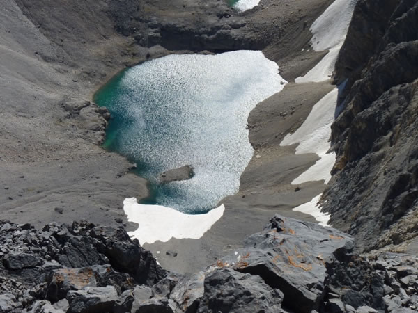 Looking down from the summit of Borah Peak onto an alpine tarn on Borah Peak's eastern flank.