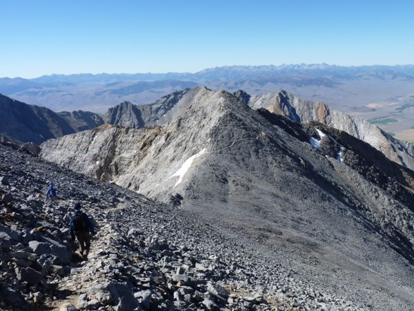 The rough trail on the western side of the mountain was more visible when we looked down onto it than it had been when we'd climbed up this side of Borah Peak two hours earlier.