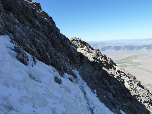 We then scrambled down below the notch and made our way towards the tongue of snow that we had to cross. A group of three people can be seen behind Eric on the far side of the snow tongue. They had turned round at the notch: Chicken Out Ridge is a truly well-named feature of the climb. |