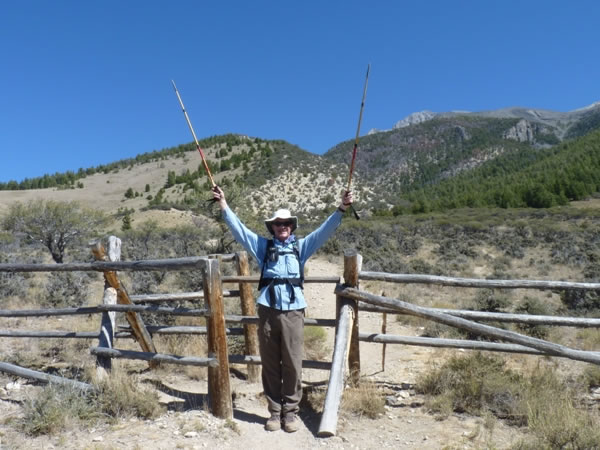 Fourteen months after Eric's crossed hiking poles at the trailhead had illustrated the failure of our first attempt to climb Borah Peak, the fact that Eric was now raising them in triumph signified the success of our second attempt. We arrived back at the trailhead at 2:00 pm – eight-and-three-quarter hours after setting out in the morning for the summit, and a little more than three-and-a-half hours after leaving the summit and starting our descent. Charlie and Diane Winger's guide book puts the "average round trip hiking time" for Borah Peak at between seven and twelve hours, so we had good reason to be pleased with our effort. |