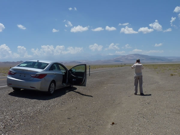 At 1:25 pm we pulled off US highway 6 and paused briefly to photograph the White Mountains in the distance and haze ahead of us.