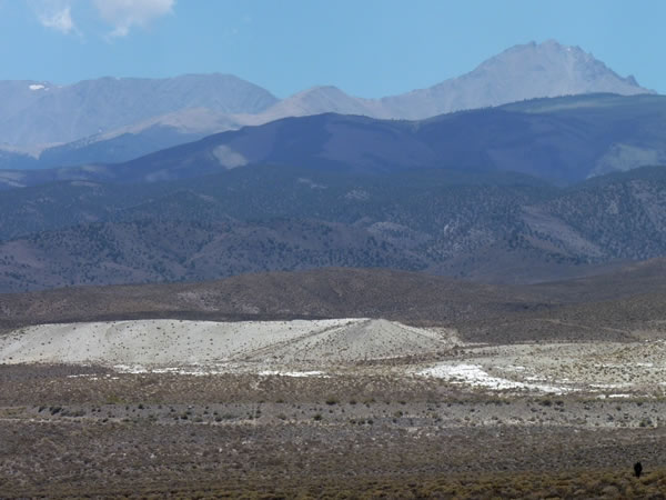 A telephoto picture taken from the junction of US highway 6 and Nevada state highway 264 looking at Boundary Peak (in the top right-hand corner of the picture) and a wild horse that’s barely visible as a black dot in the bottom right-hand corner.