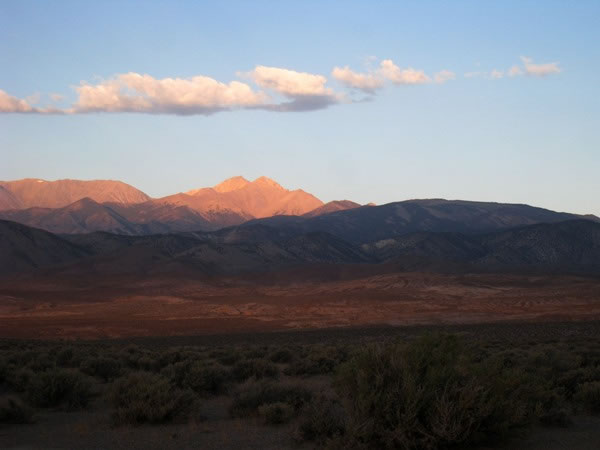 Shortly after 6:00 am, we paused while heading south-west down Nevada state highway 264 to look at the early morning sunlight on Boundary Peak. Peggy took this photograph looking across the sagebrush towards Boundary Peak (on the right) and Montgomery Peak (on the left) … |