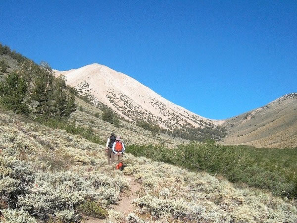 Peggy took this picture of Eric and me heading up the trail. Trail Canyon Saddle is the lowest point on the horizon, but we were not aiming for it.