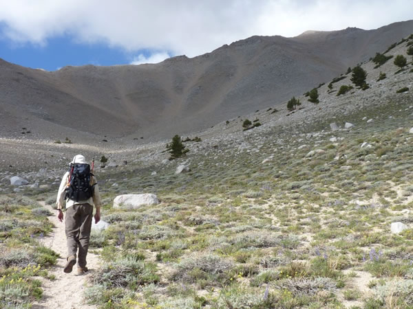 Eric entering the basin below Boundary Peak’s north ridge, which can be seen on the right-hand skyline. To the right of Eric’s hat and ski-pole is a small tree, to the right of which is a large boulder, and immediately to the right of the boulder are two small dots – namely, the two climbers who had left their white car at the trailhead and who’d filled in the intentions’ register immediately above our entry in it. |