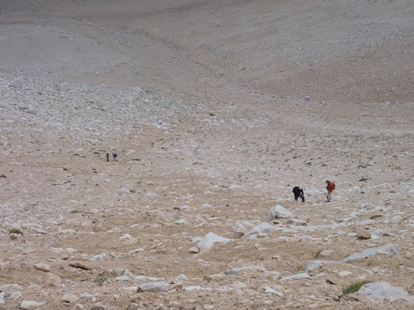 Looking back down at Peggy and Bob and David and Simon slowly switch-backing their way up the side of Boundary Peak’s north ridge.