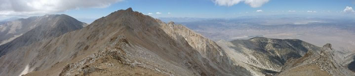 A three-shot panorama from the summit of Boundary Peak. The left-hand half of the picture looks south at Montgomery Peak and other mountains in the White Mountains range, while the right-hand half looks west towards central California.