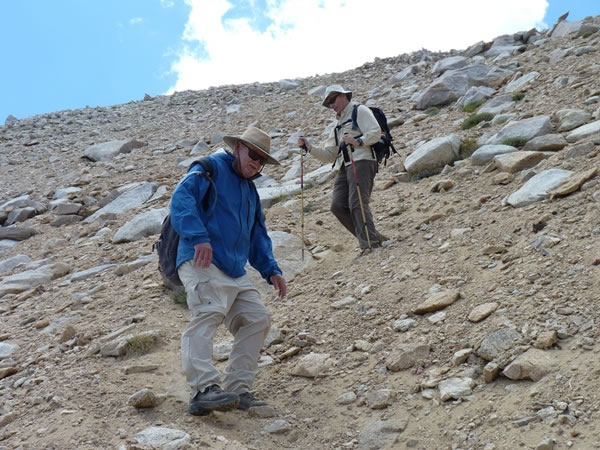 Looking up at Bob and Eric switchbacking their way down the scree slopes, and …