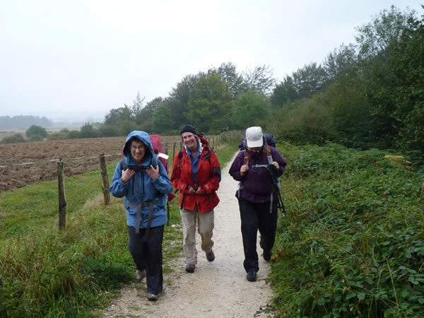 Heather (left), Ruth (also from New Zealand), and Eva (from Sweden) walking alongside a farmer’s field in light rain.