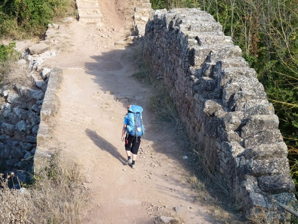 Heather crossing an old Roman bridge on the western outskirts of Cirauqui.