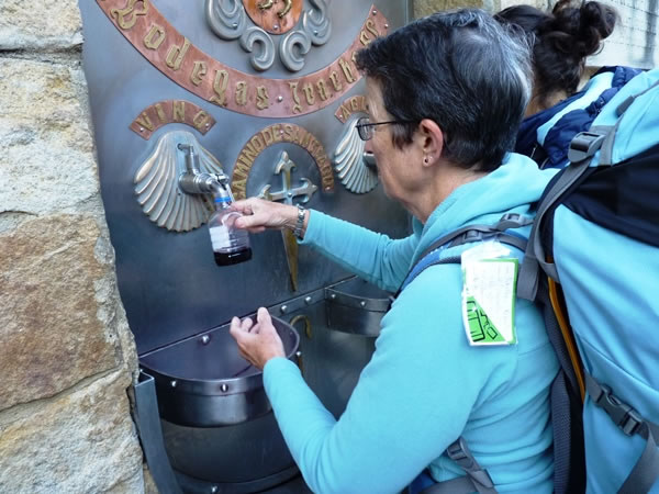 Day 5 (Tuesday, 28 September 2010) – Estella to Los Arcos (22.0 kms): Five kilometres from Estella there’s a vineyard with a fountain that gives free wine to Camino de Santiago pilgrims. In this picture, Heather’s filling a judiciously small bottle with vino tinto. |