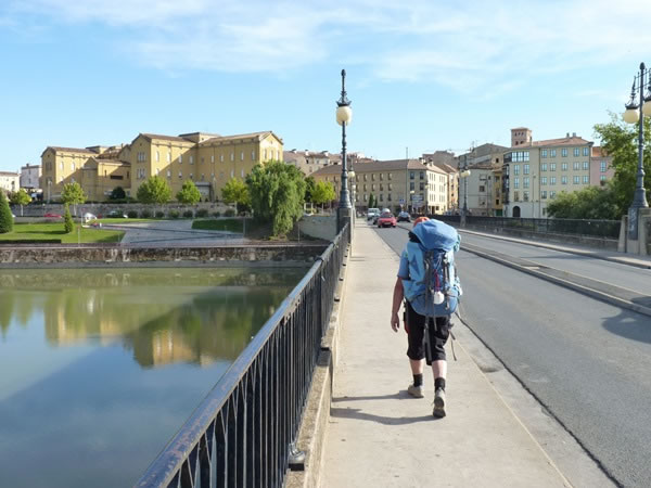 Heather crossing the Rio Ebro and entering the city of Logroño.