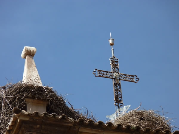A cross and storks’ nests on top of the bell-tower of the Santa Maria la Real monastery in Nájera.