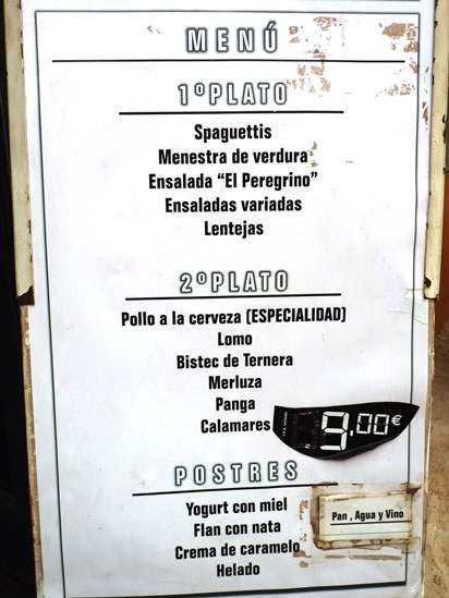 Food on the Camino: For dinner, Heather and I usually opted for the menú del dia (the menu of the day). For a fixed price – for instance, nine Euros per person in the restaurant in Azofra – one almost invariably had a three-course meal (and each course had a range of choices), plus pan, agua y vino (bread, water and wine). |