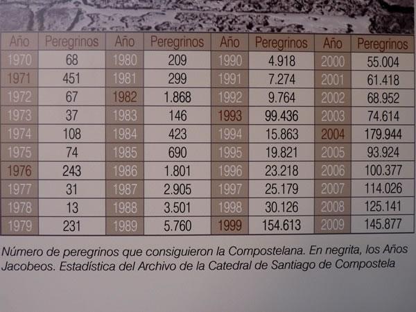 Day 11 (Monday, 4 October 2010) – Belorado to San Juan de Ortega (24.0 kms): There was a series of interesting graphs in the San Juan de Ortega hostel. This one charts the rise in the number of Camino de Santiago pilgrims. Note the huge jump each holy year (when St James’ Day falls on a Sunday). 2010 was also a holy year and the Camino de Santiago had more than a quarter of a million pilgrims on it. |