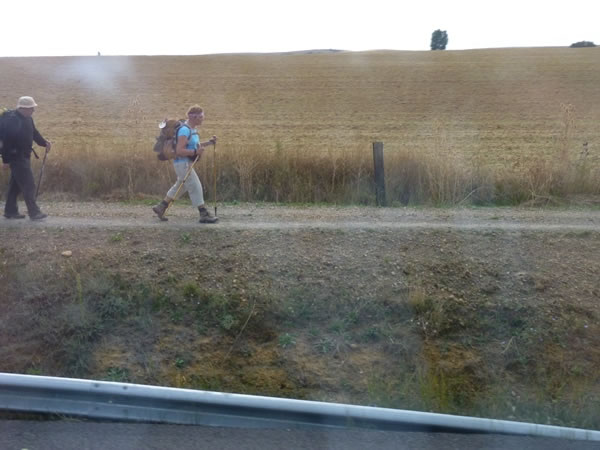Day 14 (Thursday, 7 October 2010) – by bus from Burgos to León (183 kms): Whereas both Heather and I were reasonably pleased to forego walking across the meseta, these two peregrinos that I photographed through the bus windows as we sped past them were clearly made of sterner stuff! |