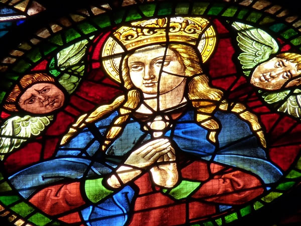 A portrait of Christ the King at the head of a seven-part stained-glass window in León Cathedral.