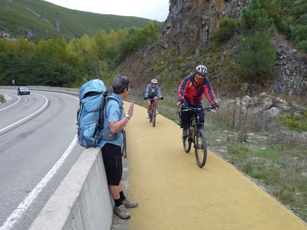 Day 18 (Monday, 11 October 2010) – Ponferrada to Trabadelo (32.5 kms): After we’d had lunch in Villafranca del Bierzo, the Camino took us along a path beside – but protected by a concrete barrier from – Spain’s N-VI highway. As the path was also a cycle-way, though, we carefully avoided being hit by cycling peregrinos. |
