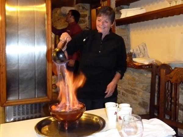 Day 19 (Tuesday, 12 October 2010) – Trabadelo to O Cebreiro (20.5 kms): After dinner in the Hotel O Cebreiro, we had a special Galician drink – quemada. This is a picture of Merilyn Newnham trying her hand at the process of burning off some of the alcohol in the drink. I should add that both the process and the drink were fiery! |