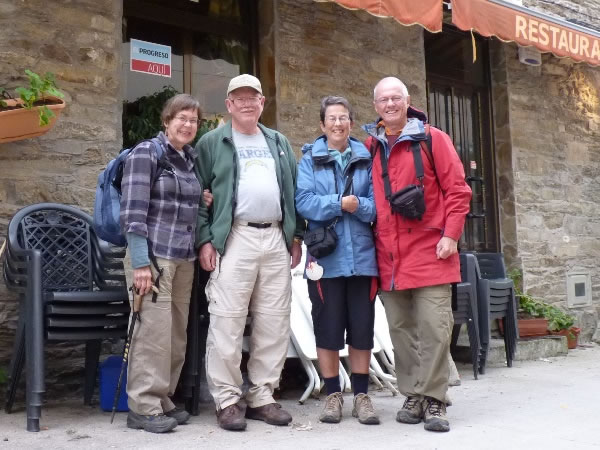 Day 21 (Thursday, 14 October 2010) – Triacastela to Sarria (26.0 kms): As we had seven days' worth of hiking left on the Camino but only six days in which to do it, early on Thursday morning, 14 October, we went from O Cebreiro to Triacastela in Bob and Peggy’s rental car and had breakfast there, after which Heather and I resumed walking the Camino and Peggy and Bob began walking it. From left to right are Peggy, Bob, Heather, and Nigel immediately prior to setting out for Sarria. |