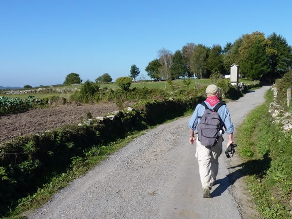 Bob walking up a narrow country lane and alongside dry-stone walls, which are very common in rural Galicia.