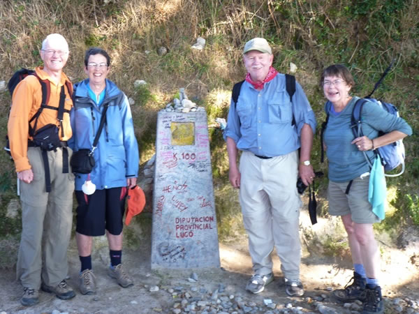 Day 22 (Friday, 15 October 2010) – Sarria to Portomarín (21.5 kms): At 11:35 am, we reached the marker indicating we had only 100 kilometres to go to get to the cathedral in Santiago de Compostela. From left to right are Nigel, Heather, Bob, and Peggy. To qualify for an official pilgrim’s compostela – a certificate of completion – from the Catholic church, peregrinos must either have walked 100 kms or cycled 200 kms, so starting a pilgrimage in Sarria is a popular choice for many people. |