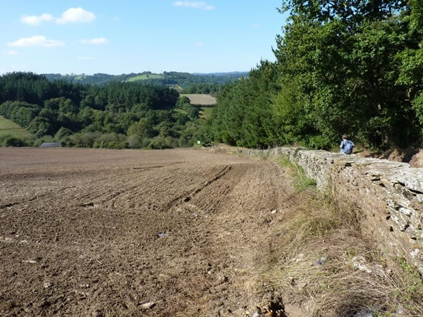 Peggy walking along a country lane beside a dry-stone wall, heading downhill towards …