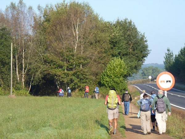 Day 23 (Saturday, 16 October 2010) – Portomarín to Palas de Rei (22.0 kms): To qualify for a compostela, the Catholic church's certificate vouching that a pilgrim has walked the Camino, peregrinos have to have walked at least the last 100 kilometres to Santiago de Compostela. As we were now well past the 100-kms-to-go mark, the Camino at this stage was far busier than we'd ever before experienced it. Here's a picture of a traffic jam on a senda – i.e., on a roadside path – between Portomarín and Palas de Rei. |