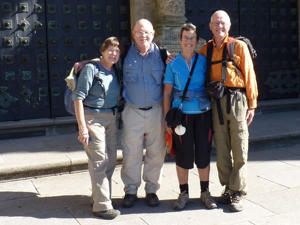 Peggy, Bob, Heather, and Nigel in front of the doors of the Santiago de Compostela Cathedral.