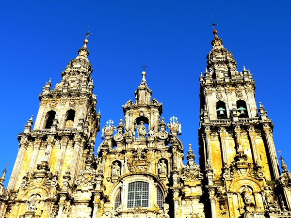 The ornately decorated towers of the Santiago de Compostela Cathedral.