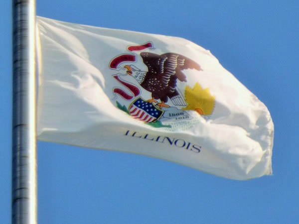Illinois is one of only three states with a plain white flag featuring the state’s seal. The other two are Massachusetts and Rhode Island, both original states and both without the state’s name on their flag. The words on the red banner the eagle is holding between its teeth are the state motto: State Sovereignty, National Union. |