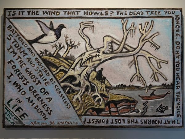 , by the well-known New Zealand artist, Nigel Brown. The painting includes words …